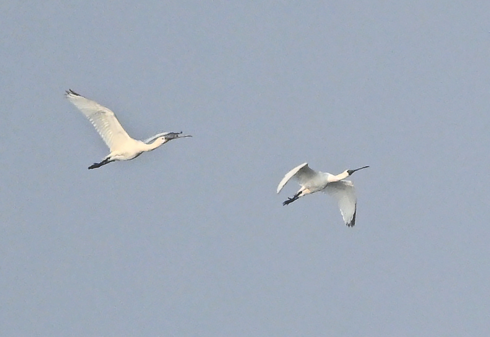 黑脸琵鹭(右)在空中飞翔。李剑志摄
