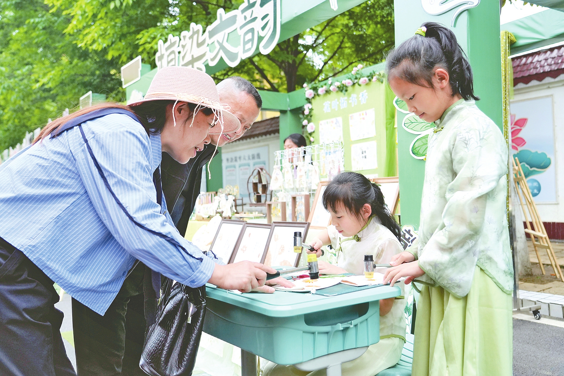非遗手工体验区前,家长和学生一起体验传统手艺。 刘馨予摄