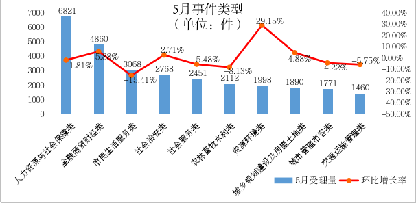 从受理事件大类分析:5月份,资源环境类环比增长29.15%,金融商贸财经类环比增长5.88%,城乡规划建设及房屋土地类环比增长4.88%。