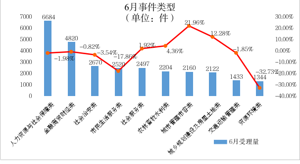 从受理事件大类分析:6月份,城市管理市容类环比增长21.96%,城乡规划建设及房屋土地类环比增长12.28%,农林畜牧水利类环比增长4.36%。
