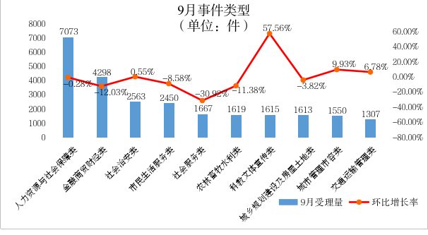 从受理事件大类分析:9月份,事件受理量居前三位的分别为:人力资源与社会保障类、金融商贸财经类、社会治安类。总体情况平稳,无突发和群体性事件。