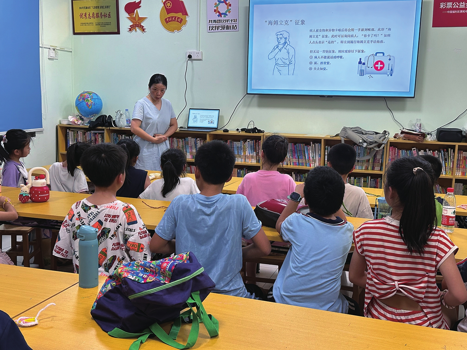 活动现场,来自段意花工作室的讲师通过生动易懂的PPT与视频,向孩子们普及中暑的成因与表现,针对日常生活中可能遇到的异物卡喉、心脏骤停等紧急突发状况,借助人体模型重点讲解演示了“海姆立克急救法”和心肺复苏术的规范操作步骤。“海姆立克的关键是快速冲击腹部——‘剪刀石头布’法要牢记!”讲师边解说边示范,“互救时身后抱、脐上拳、快速挤,自救可顶椅背压腹部反复冲。”简单的口诀与直观的演示点燃了孩子们的学习热情,纷纷踊跃参与模拟操作。在“手把手”教学中,孩子们反复练习手势与发力角度,逐步掌握急救要领。现场互动热烈,提问声、演练指导声此起彼伏,实用的技能在轻松氛围中深入人心。