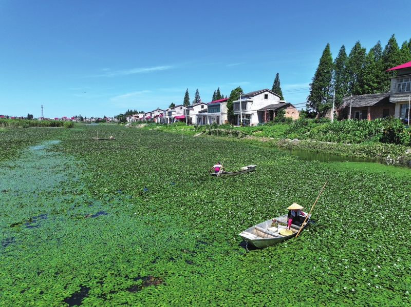 村民撑着小船采摘野生菱角。钟祖彪摄