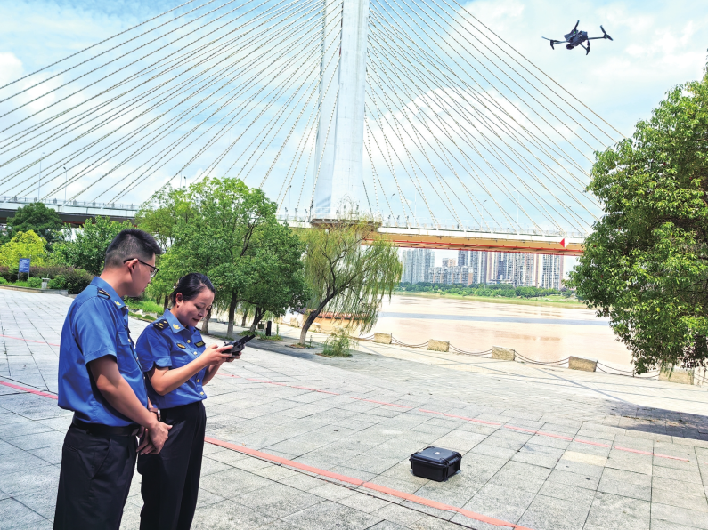指挥中心工作人员遥控无人机,观察资江有无市民私自下水游泳的情况。李娜摄