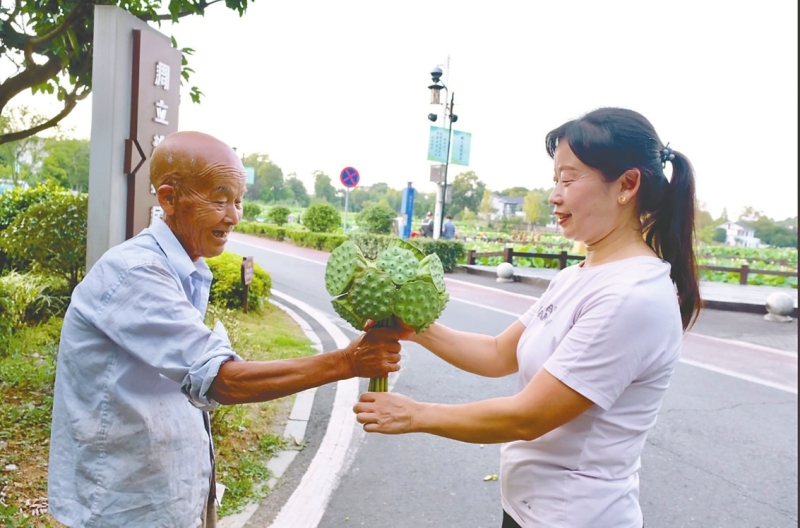 时值盛夏,荷花满池。每年这个时候,80多岁的张端元就会挑着一根扁担、两个箩筐,在村里叫卖莲蓬。“我以前是不卖莲蓬的,过去的水和地哪能开塘养莲蓬。近几年,村里环境变好了,我家门口的4亩水塘才有了用处。”张端元感慨地说,现在村里有人气、有风景、有阳光,有时候他挑着莲蓬走在路上,还会痴痴地望风景。“比起去儿子城市里的家,我更愿意留在村里养老。”张端元笑着说。