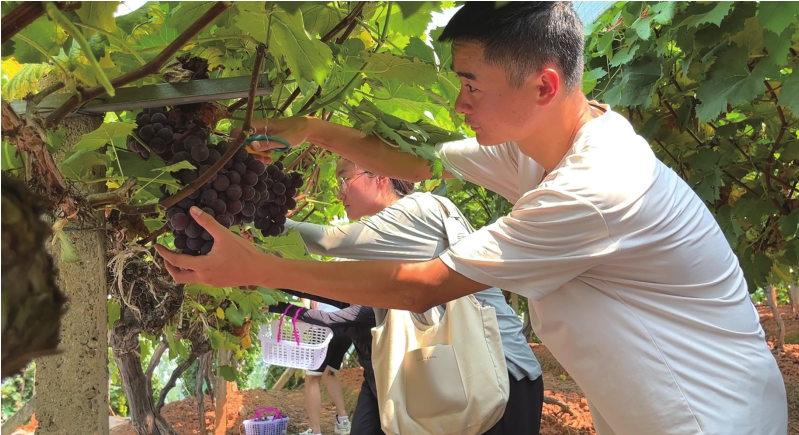 8月8日,走进葡萄园,紫黑饱满的夏黑、香气馥郁的醉金香、青绿如玉的阳光玫瑰宛如晶莹的宝石,在阳光的照耀下熠熠生辉。游客们手持剪刀、提着果篮,穿梭在藤蔓交错的葡萄架下,精心挑选着心仪的果实。葡萄园的另一侧,果农们正忙着采摘、装框,一派喜人的丰收景象。