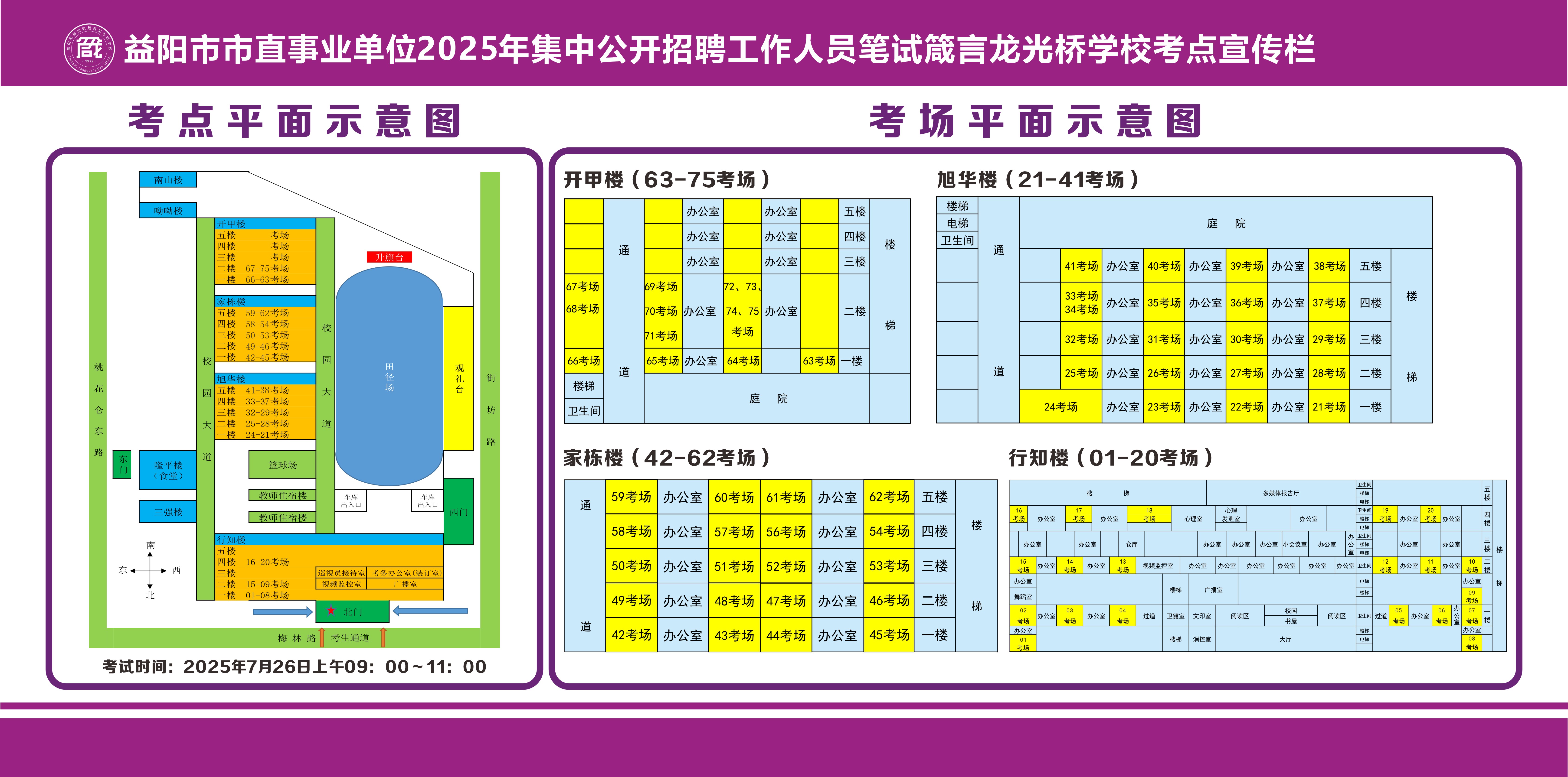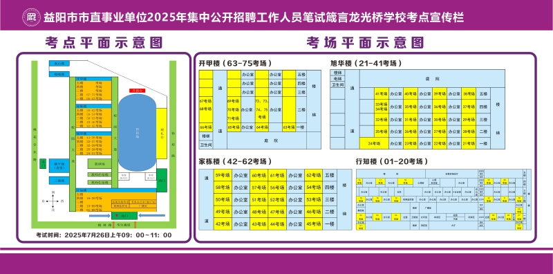 另,益阳市市直事业单位2025年集中公开招聘工作人员笔试将于2025年7月26日上午9:00-11:00进行,考试时长120分钟。开考30分钟后考生不得进入考场,考试过程中不得提前交卷退场。准考证打印时间为2025年7月23日9:00-7月26日9:30,准考证上不须盖章,请考生打印准考证后仔细阅读准考证上相关信息、注意事项和温馨提示,确认好自己准考证上标示的考点名称和考点地址,按规定参加考试。
