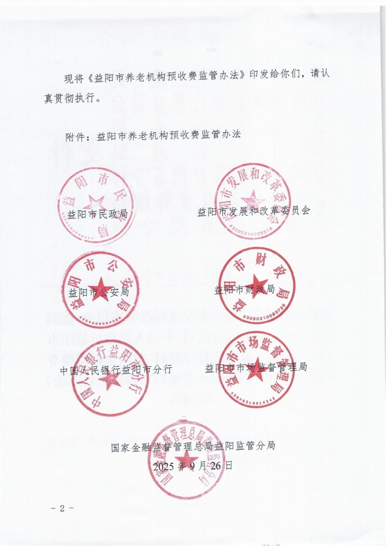 益阳市民政局 益阳市发展和改革委员会 益阳市公安局 益阳市财政局 中国人民银行益阳市分行 益阳市市场监督管理局 益阳金融监管分局关于印发《益阳市养老机构预收费监管办法》的通知 益民发[2025]8号