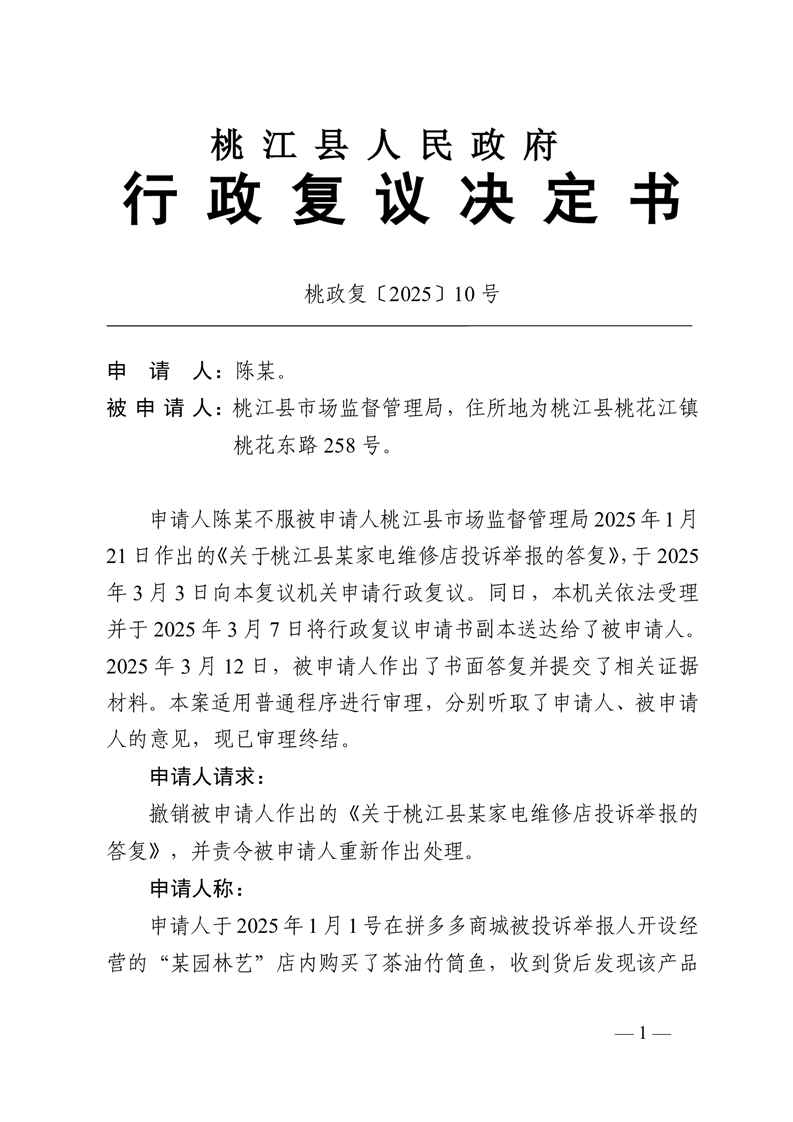 行 政 复 议 决 定 书桃政复〔2025〕10号