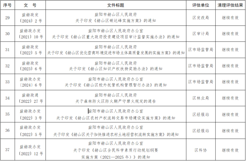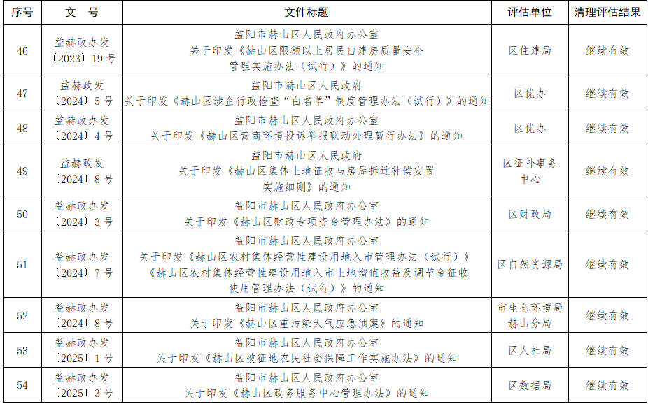 一、现行有效文件:《益阳市赫山区人民政府关于全区重点水域禁止捕捞的通告》(益赫政通〔2019〕23号)等54件规范性文件(详见附件1),因文件尚在有效期之内,需继续沿用,并且其制定主体、权限、程序、内容、形式均合法,现确认现行有效。
