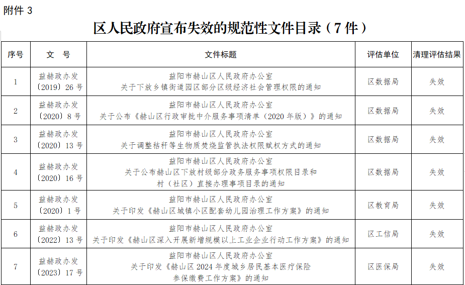 三、失效文件:《益阳市赫山区人民政府办公室关于下放乡镇街道园区部分区级经济社会管理权限的通知》(益赫政办发〔2019〕26号)等7件规范性文件(详见附件3),因文件有效期届满工作任务已完成或有效期未满但工作任务完成、调整对象消失、管理方式改变、经评估不需继续执行,现宣布失效。
