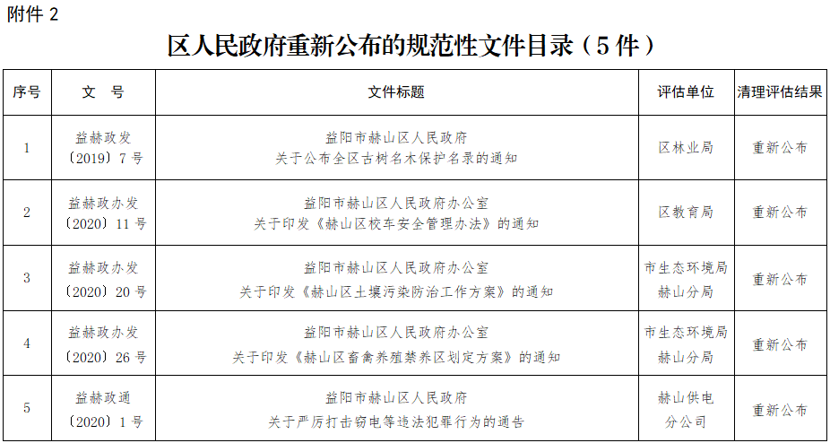 二、重新公布文件:《益阳市赫山区人民政府关于公布全区古树名木保护名录的通知》(益赫政发〔2019〕7号)等5件规范性文件(详见附件2),因文件有效期已经届满或即将届满,经评估确认文件有继续保留的必要,并且文件内容合法,经研究确认重新公布,重新公布的文件其有效期自本决定公布之日起重新计算。