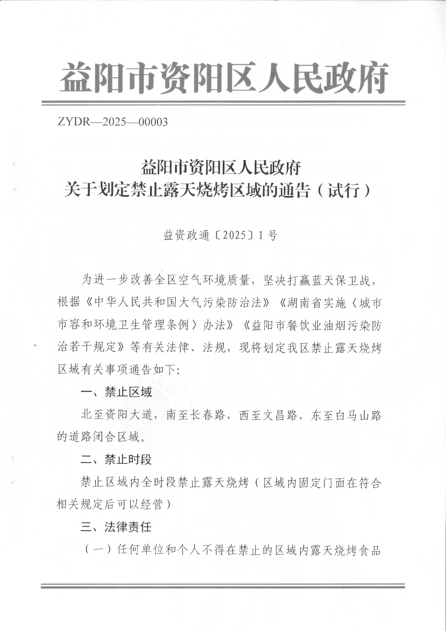 益阳市资阳区人民政府关于划定禁止露天烧烤区域的通告(试行)