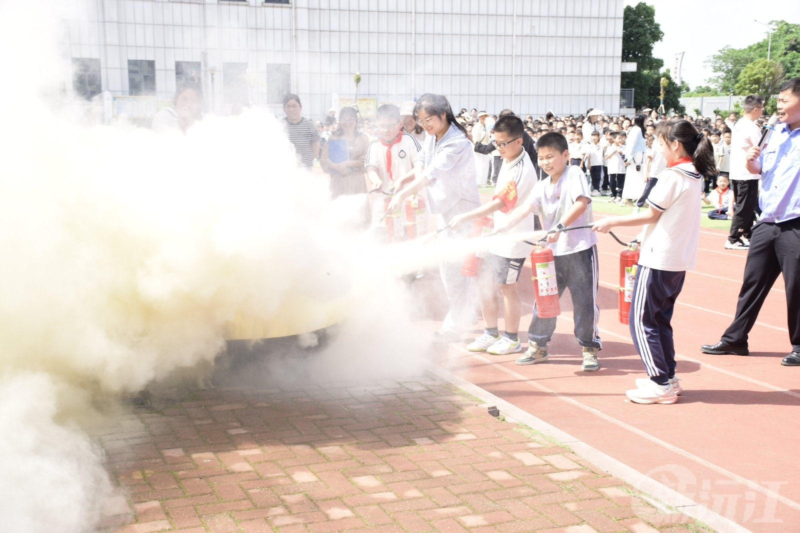 火场逃生演练结束后,活动进入消防器材实操教学环节。沅江市消防大队工作人员手持干粉灭火器,详细讲解“一提二拔三握四压”的操作要领,着重强调对准火源根部喷射的关键技巧。随后,市消防大队工作人员现场演示规范灭火流程,直观展现正确操作的重要性。在实操体验中,师生代表在消防员指导下,有条不紊地完成灭火操作,成功熄灭火苗。现场此起彼伏的掌声,既是对成功灭火的喝彩,更是对消防知识学以致用的见证。