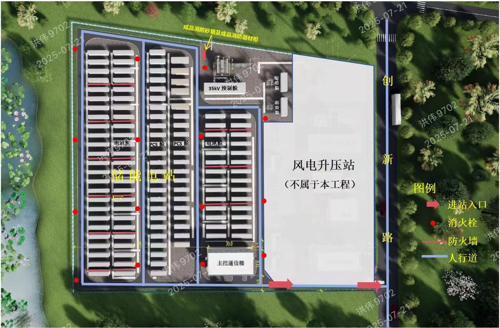 该项目设计方案已经2022年第07期国土空间规划委员会二级专题会审查通过。该项目位于南大膳镇双学垸创新路西侧。场地北侧布置一台140MVA主变,在140MVA南侧布置35KV配电预制舱,主变东侧布置一套GIS设备、场地东部从北到南布置两套SVG。场地南侧布置1栋主控通信楼。主控通信楼南侧退让用地界线13.8m。机动车停车位3标台。