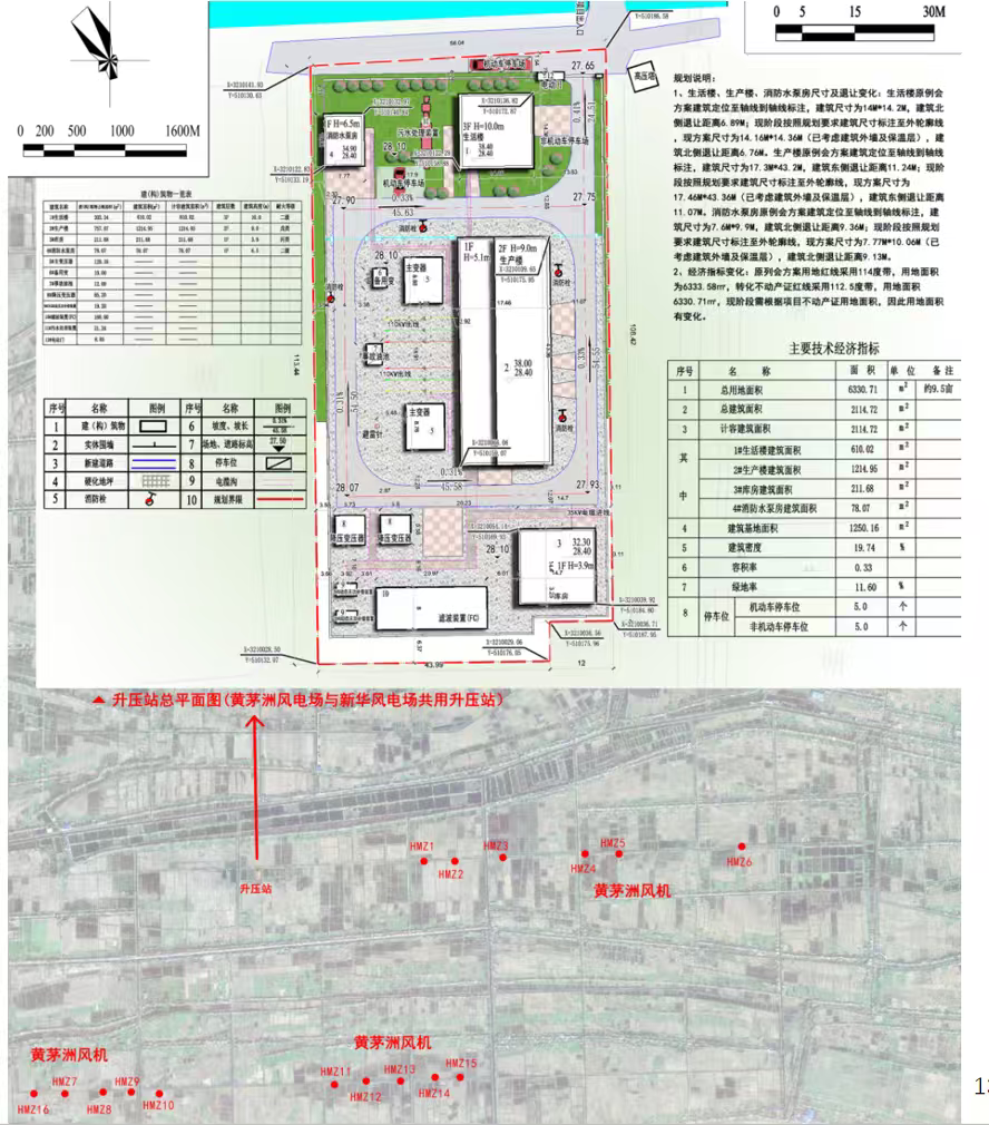 项目位于沅江市黄茅洲镇中部,志成村、马粮山村、黄栗塘村和新河口村村内。规划分两排布置16个风电发电机组,第一排布置6个风电发电机组(单机装机容量3.0MW风机,编号HMZ1-HMZ6);第二排布置10台风电发电机组(其中4台单机装机容量3.0MW风机,编号HMZ7-HMZ10;6台单机装机容量3.3MW风机,编号HMZ11-HMZ16)。总装机容量49.8MW。每个风机位设置1座风电发电塔和1座变压器。符合相关法律法规和行业规范建设要求。