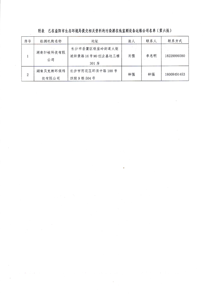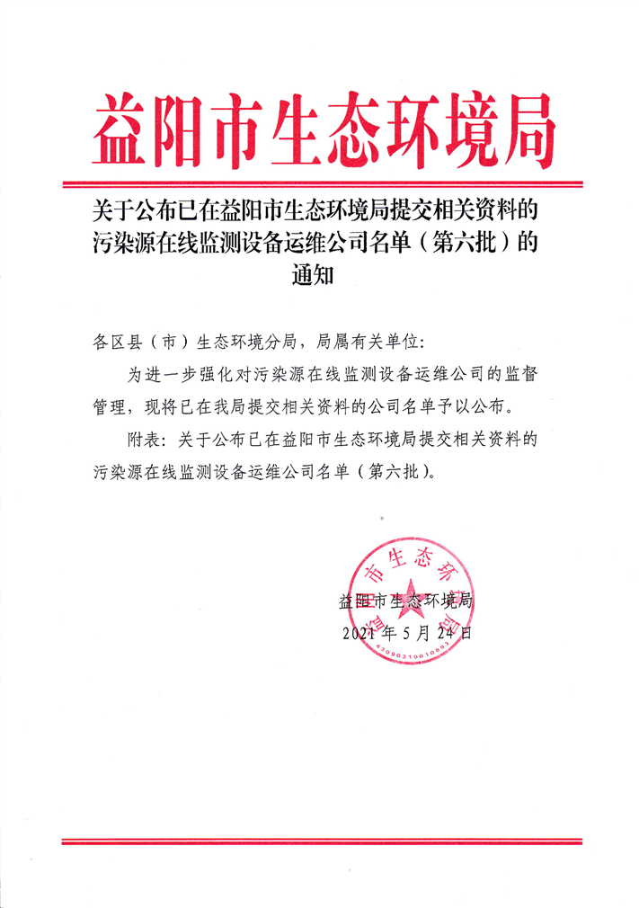 关于公布已在益阳市生态环境局提交相关资料的污染源在线监测设备运维公司名单(第六批)的通知