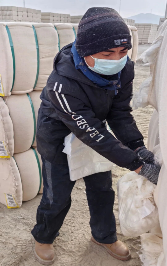 与此同时,另一项取样工作并行不悖。另一位取样员刘工从同一棉包的压缩面,同样在去掉表层棉花后,抽取完整成块、未被破坏的样品不少于125克。“这部分样品,”刘工补充道,“将单独封装,作为品质检验批样,后续用于测量长度、强度、马克隆值等关键指标。重量检验是当下,品质检验关乎未来,两者样本必须独立、具有代表性。”