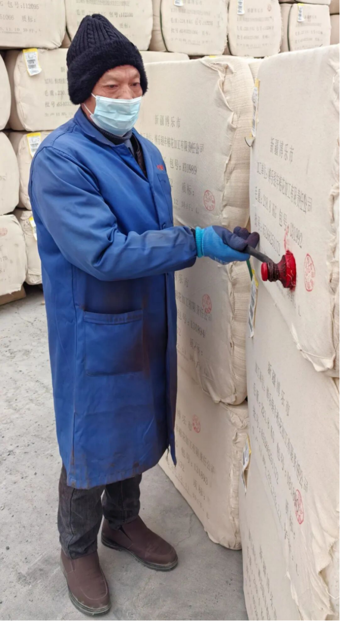 随后,他在内层于距棉包外层10-15厘米处,均匀取样。“看,从这里取出的棉花,性状最稳定。”他一边操作,一边介绍。这些从多个棉包取出的样品被汇集在一起,形成一个总重量不少于600克的含杂率检验批样。