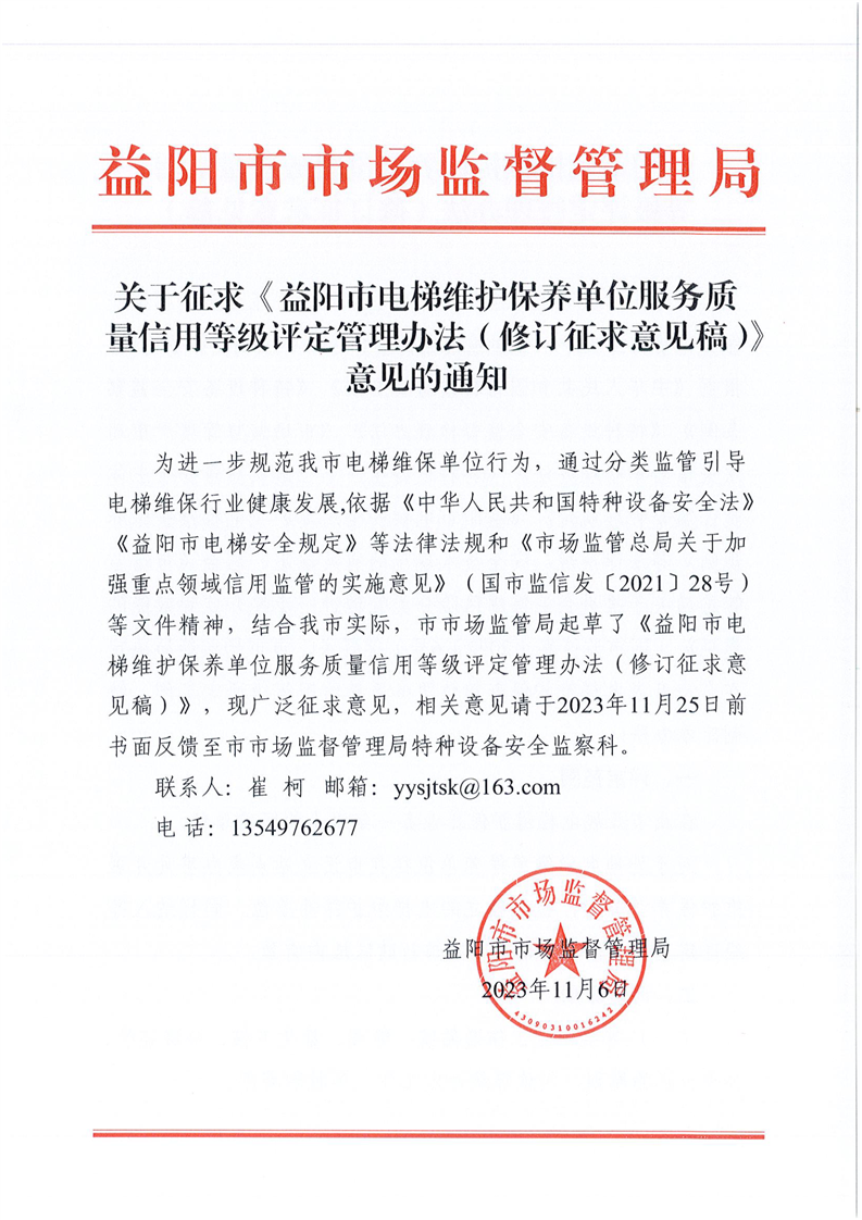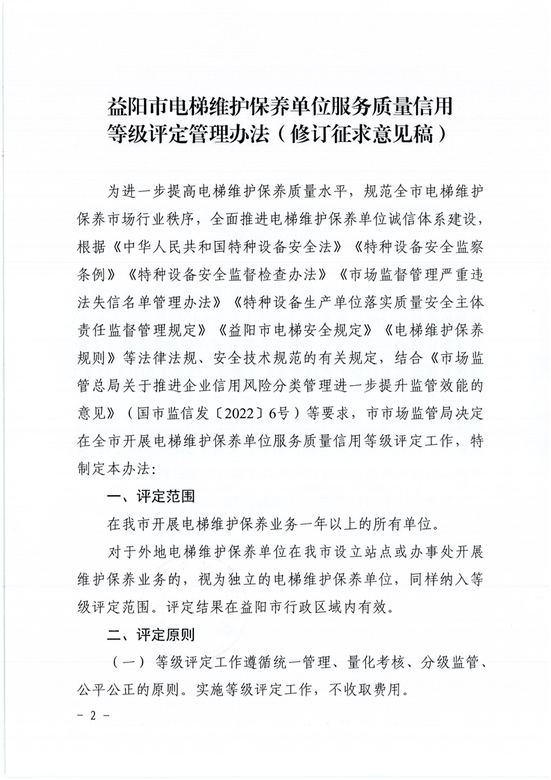 | 关于征求《益阳市电梯维护保养单位服务质量信用等级评定管理办法(修订征求意见稿)》意见的通知 |