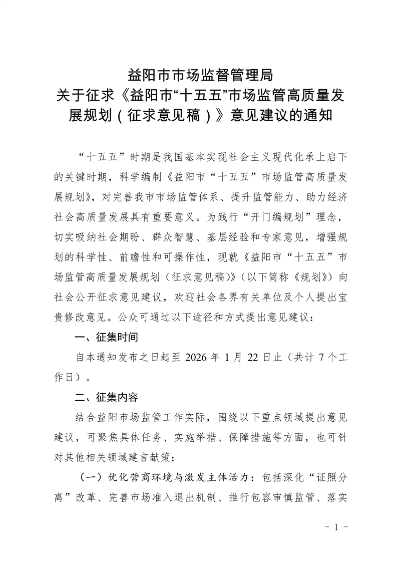 | 关于征求《益阳市“十五五”市场监管高质量发展规划(征求意见稿)》意见建议的通知 |