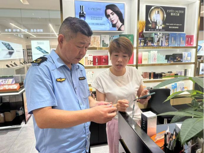 店家是否虚假宣传?工作人员对经营单位店内宣传海报、电子屏宣传内容等进行检查,主要围绕是否存在夸大功效、虚假宣传,是否使用明示或者暗示具有医疗作用的广告用语等,告诫店家不得夸大、虚假宣传化妆品功效。