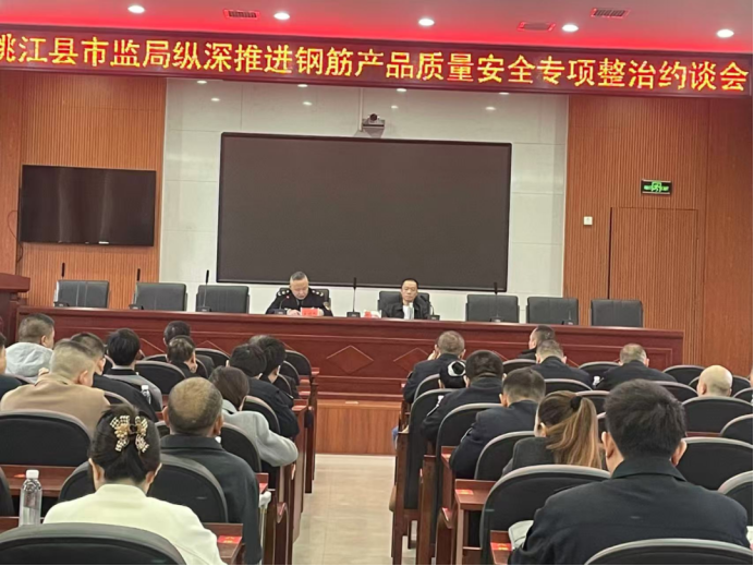11月11日,桃江县市场监督管理局组织召开纵深推进钢筋产品质量安全专项整治经营主体约谈会,全县39家钢筋产品销售门店负责人参会。