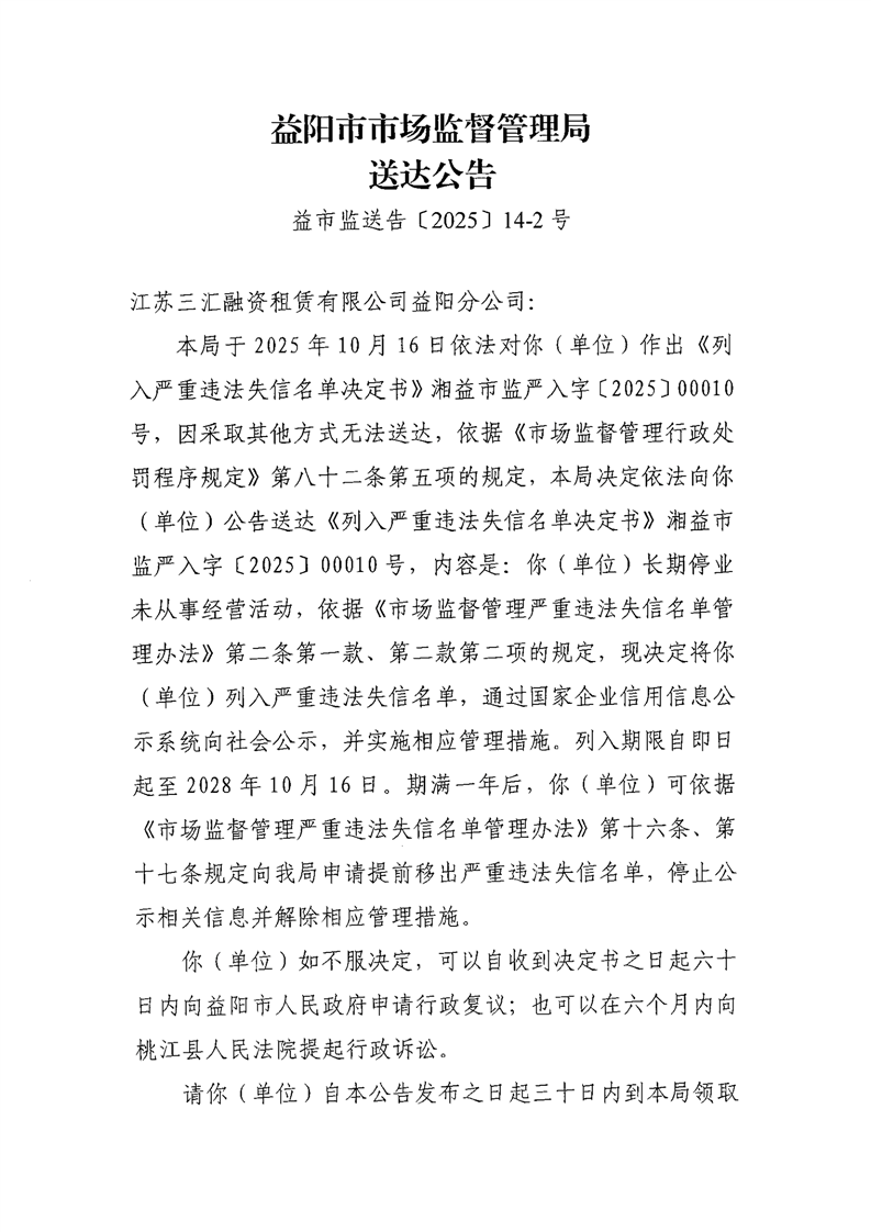 | 送达公告(益市监送告[2025]14-2号)(江苏三汇融资租赁有限公司益阳分公司) |