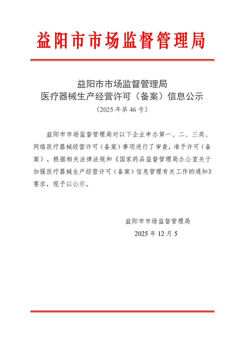 | 医疗器械生产经营许可(备案)信息公示(2025年第46号) |