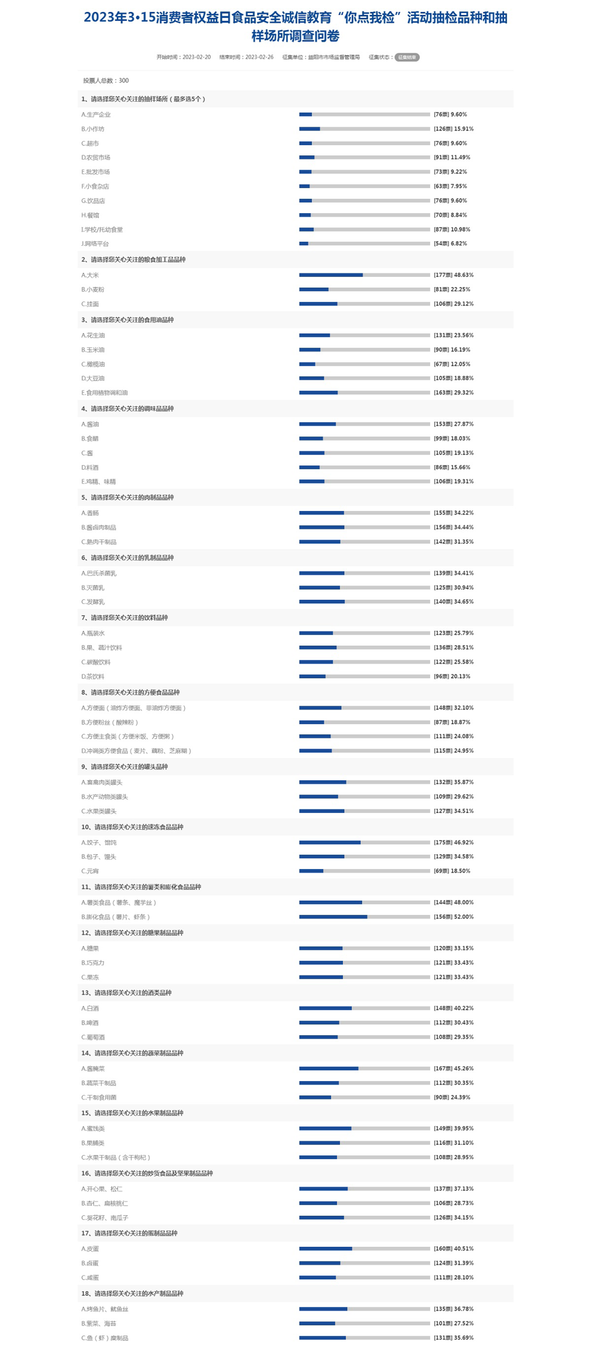 | 关于2023年3•15消费者权益日食品安全诚信教育“你点我检”活动抽检品种和抽样场所调查问卷的结果反馈 |