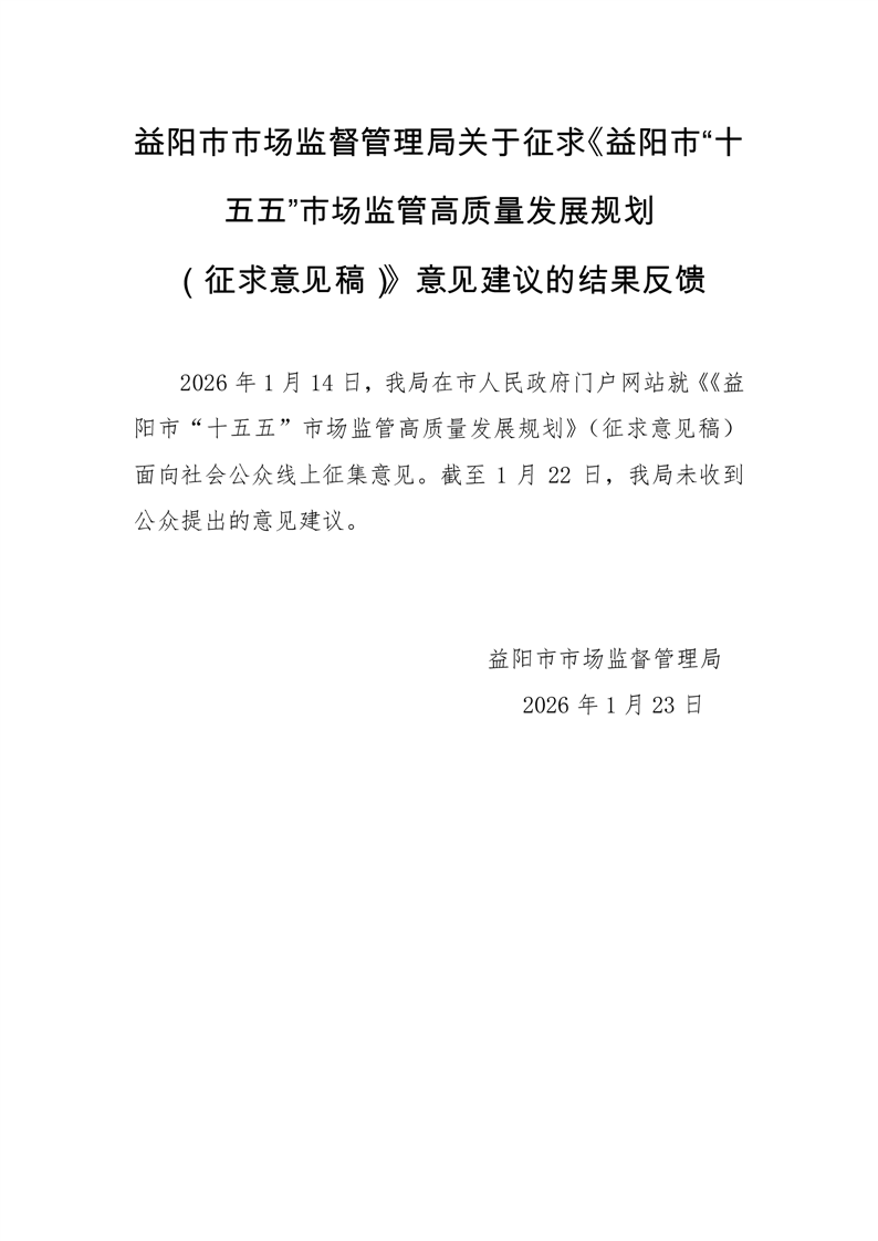 | 关于征求《益阳市“十五五”市场监管高质量发展规划 (征求意见稿)》意见建议的结果反馈 |