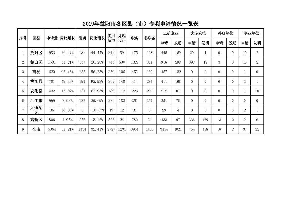 | 2019年益阳市各区县(市)专利申请情况一览表 |