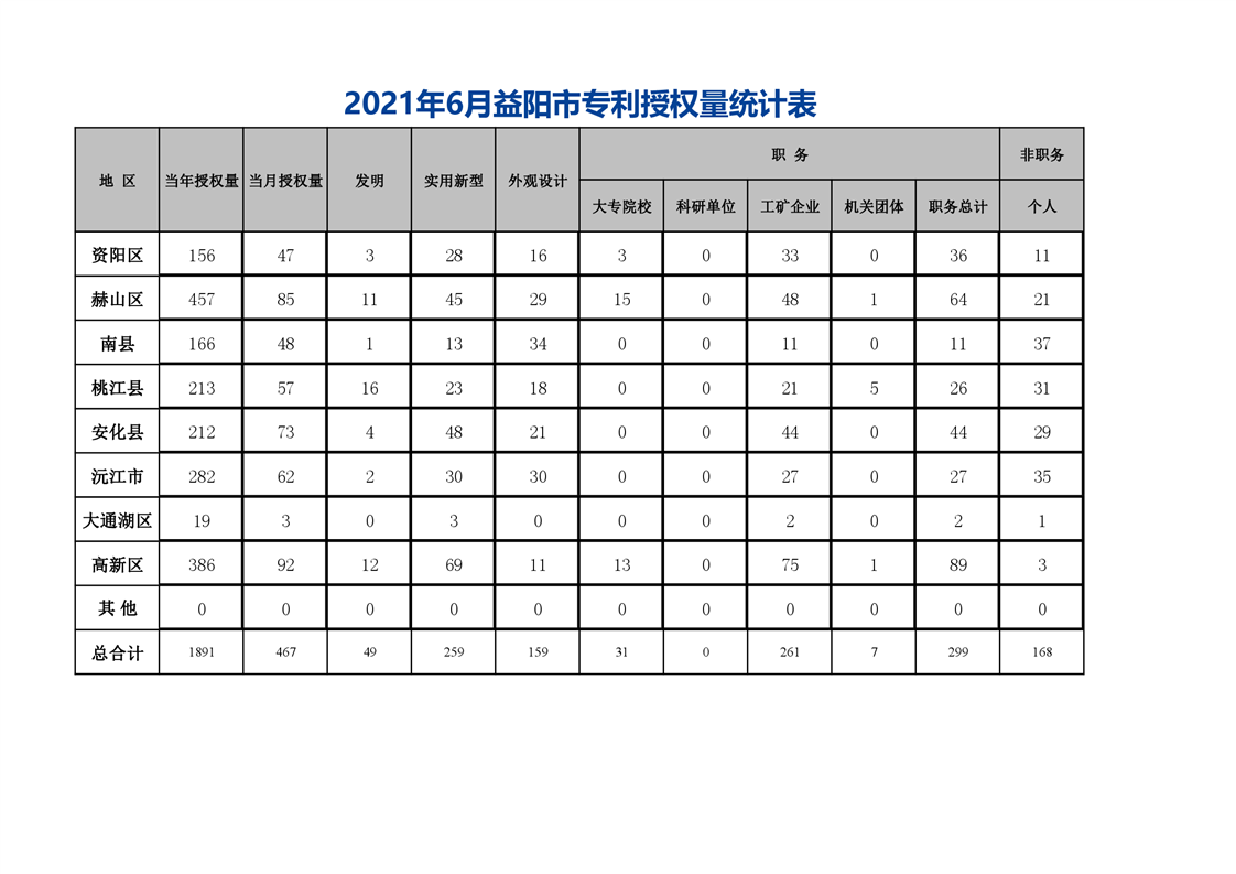 | 2021年6月益阳市专利授权量统计表 |
