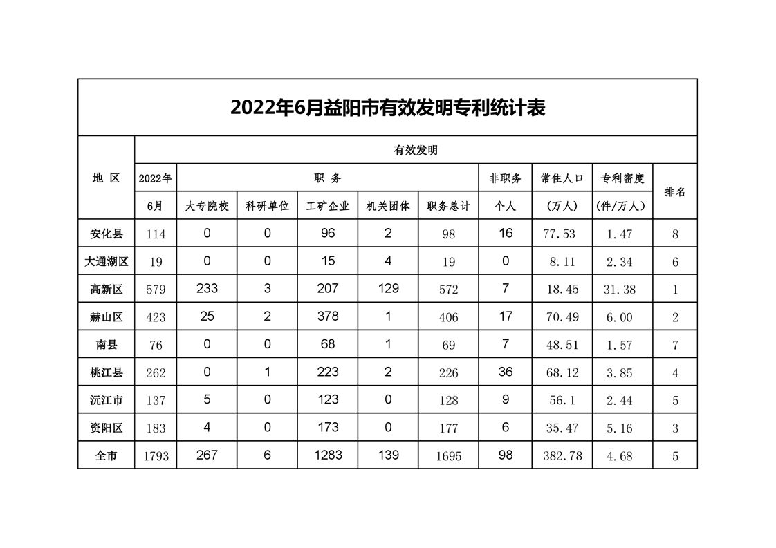 | 2022年6月益阳市有效发明专利统计表 |