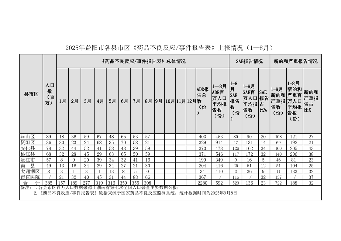 | 2025年益阳市各区县《药品不良反应事件报告表》上报情况(1—8月) |