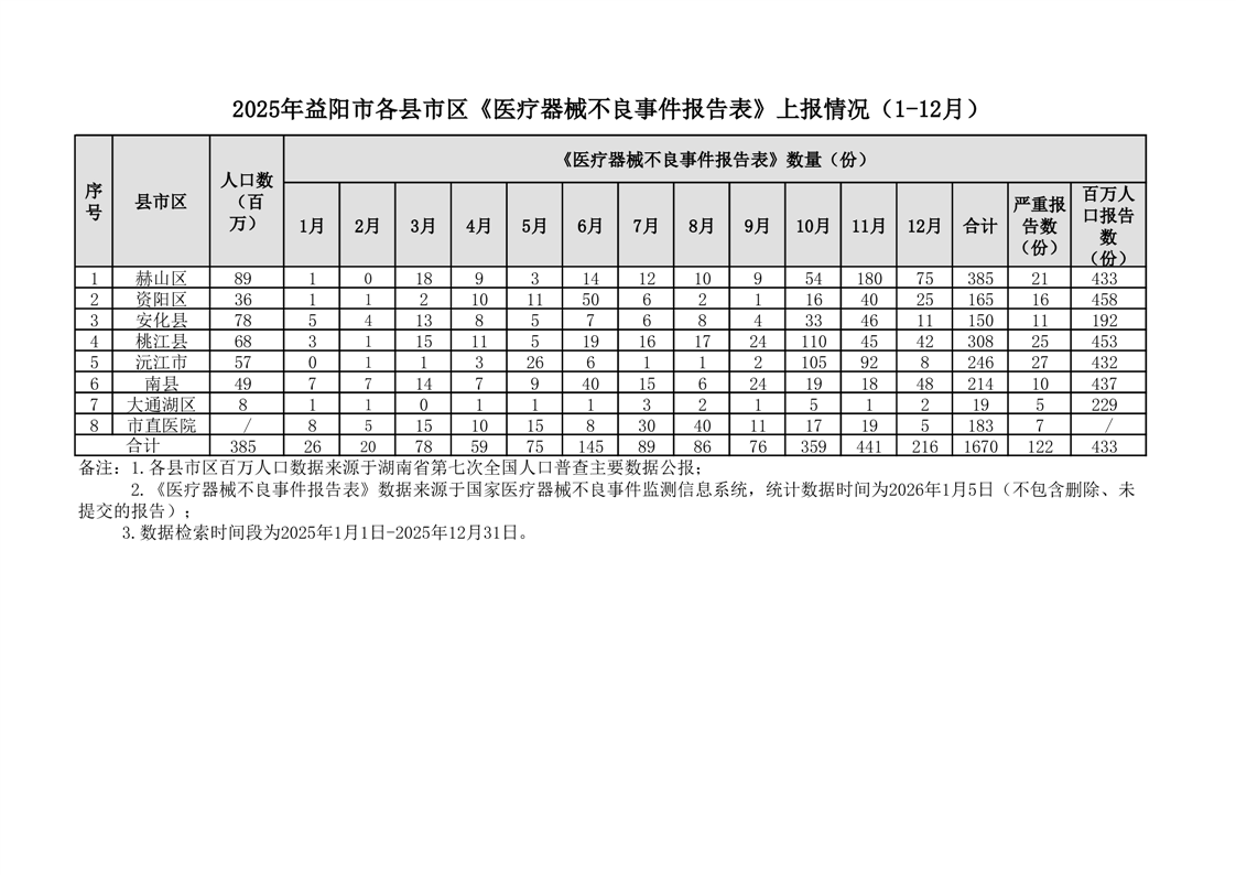 | 2025年益阳市各区县《医疗器械不良事件报告表》上报情况(1—12月) |