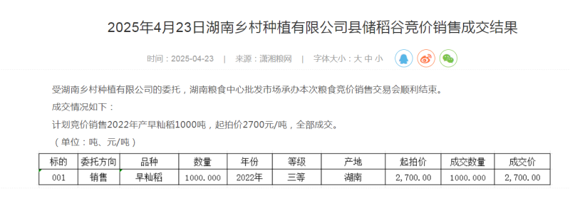 4月23日,大通湖区2022年产县级储备早籼稻在湖南粮食交易平台成功挂拍。本次交易的1000吨早籼稻以2700元/吨的起拍价全部成交,创下湖南省同品种储备粮网上一次性成交的最高价格纪录。