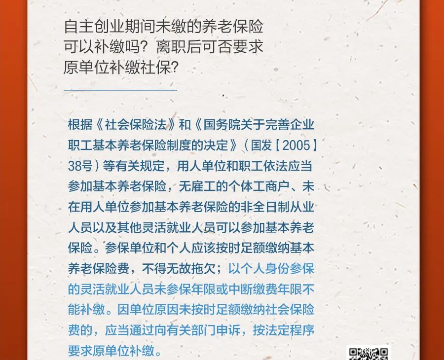 【温暖社保·每周一课】自主创业期间未缴的养老保险可以补缴吗?离职后可否要求原单位补缴社保?