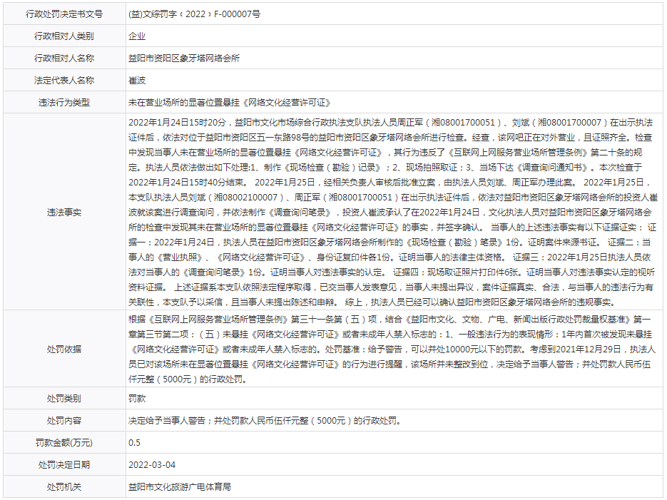 【行政处罚】益阳市资阳区象牙塔网络会所