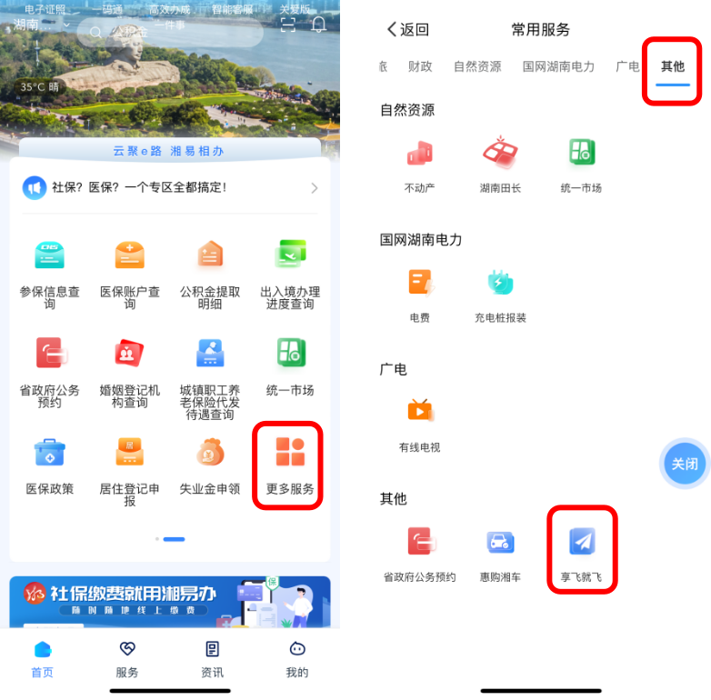 登陆“湘易办”APP后,在首页搜索“享飞就飞”,或在首页金刚区选择“更多服务”,选择“其他”,找到“享飞就飞”,点击即可进入服务。