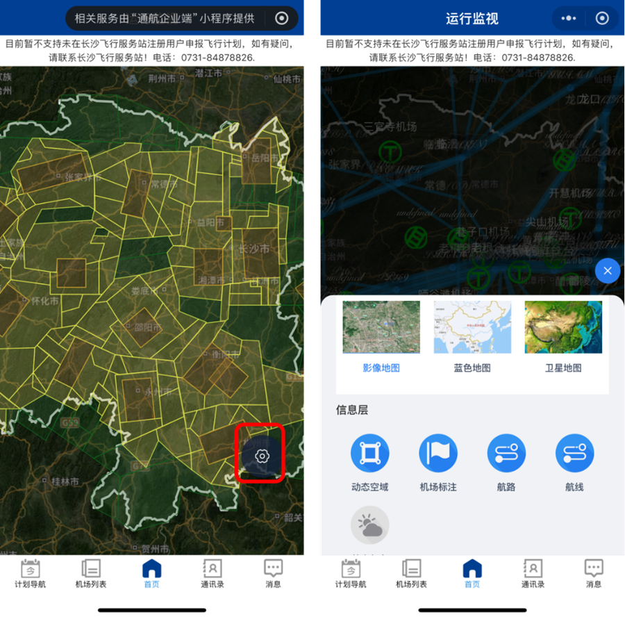 点击图示的设置按钮,可设置地图类型和信息层。选择地图是否显示动态空域、航线、航路、机场标注等信息。
