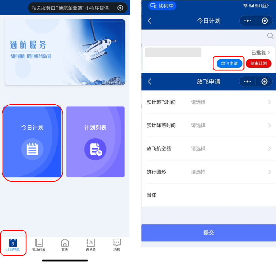 点击“放飞申请”进入申请操作页面,选择起降时间,执行航空器,以及执行区域,如有其他信息可在“备注”中填写,提交即完成放飞申请工作。