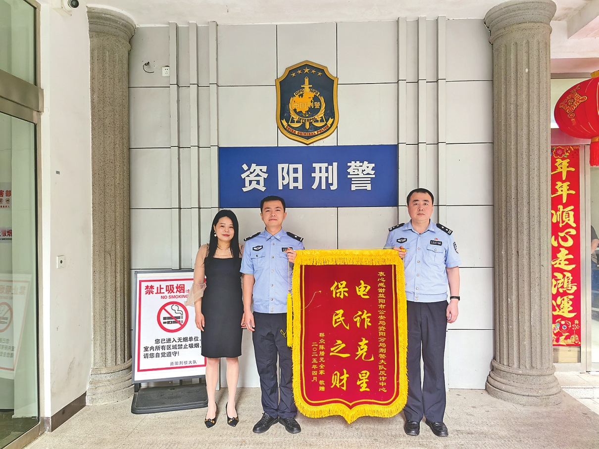 2025年4月23日,电信网络诈骗受害人陈女士为其紧急止付50万元的民警送锦旗。