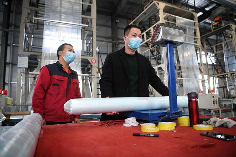 2022年1月28日,闽商郑开煌(右)在位于宁夏隆德县闽宁扶贫产业园的农用薄膜生产线查看产品质量。新华社记者 王鹏 摄