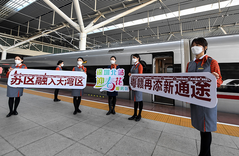 2021年12月10日,深圳北站工作人员在赣深高铁深圳北站开往南昌西站的首班列车前留影。新华社记者 毛思倩 摄