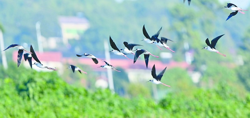 上图:黑翅长脚鹬长长的红脚飞起来是一道靓丽的风景线。