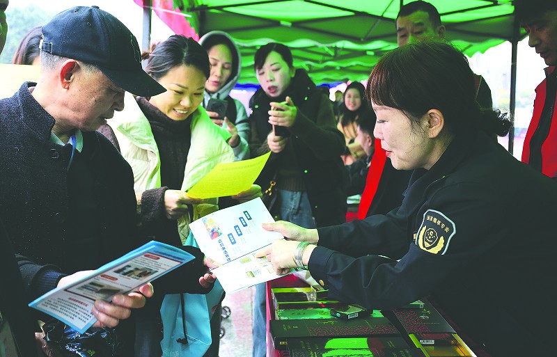 3.15活动期间,工作人员向市民讲解防范非法电子烟相关知识。李胜利摄