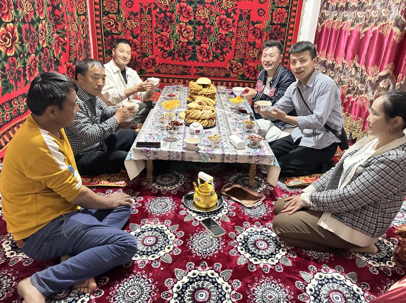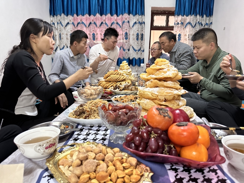 随后,大家被邀入席,盘腿围坐长桌两侧,吃馓子、尝干果、品美食。“快尝尝我妈炸的糕点、凉拌面。”阿米娜挨个往大家手里塞糕点、倒茶水。17时许,抓饭做好、羊肉煮熟、烤鸡出炉……一道道维吾尔美食轮番端上来,阿米娜家人和大家有说有笑地吃起来。“味道太美了,今天把肚子都吃撑了!”返回告别时,援疆队友和同事们直夸阿米娜与她妈妈的好厨艺。离别之际话重逢,大家开始约定两个月后的古尔邦节再聚会。