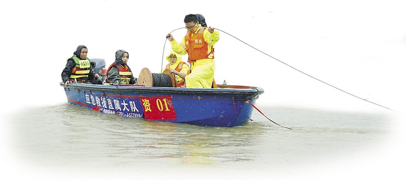 7月1日,资阳区沙头镇技术专家水下布设光纤助力防汛。黄云摄