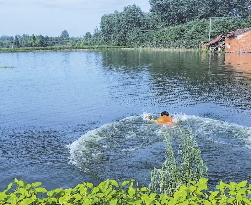 7月2日,大通湖区金盆镇防汛指挥所从各村(社区)抽调20名水性好的防汛队员开展拉网式排查。大家潜入距堤100多米的池塘中,手摸脚踩,了解水下情况。李娜摄